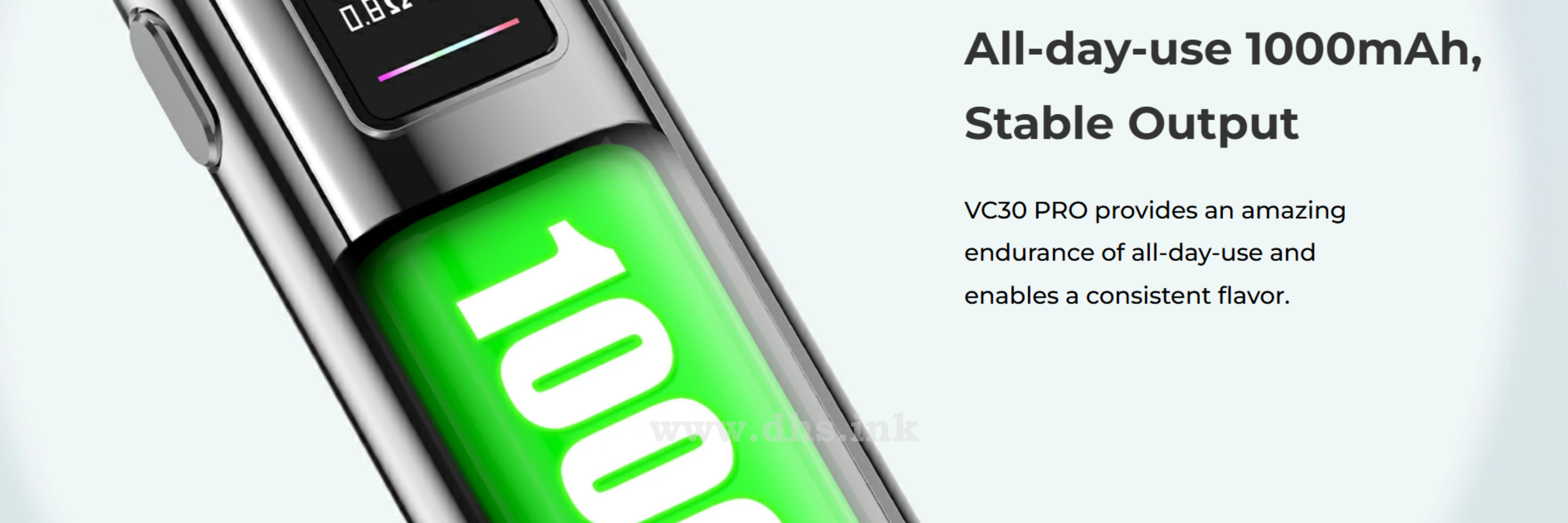 Незважаючи на компактні розміри, под система Vecee VC30 Pro оснащена потужним акумулятором ємністю 1000 мАг, якого достатньо для повноцінного використання протягом усього дня. Пристрій підтримує функцію швидкої зарядки зі струмом 1,5 А, що дає змогу швидко відновити заряд батареї.